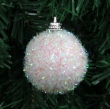 6 śnieżnobiałych bombek z połyskującymi nićmi.