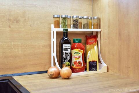 Dwupiętrowa półka np. na przyprawy i aromaty. Wykonano z wytrzymałego plastiku. Wymiary: 34,5 x 16,5 x 31,5 cm.