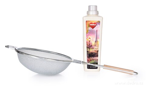 Cedzak z podwójnym sitem ze stali nierdzewnej, uchwytem i drewnianą rączką dla prostej manipulacji. Średnica 21 cm, długość 48,5 cm.