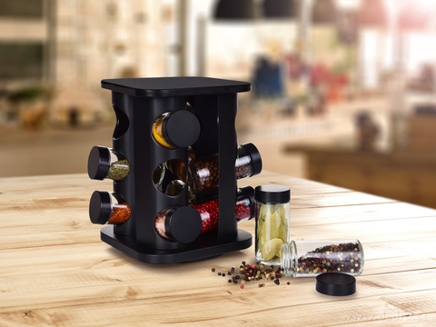 KARUZELA NA PRZYPRAWY, obrotowy stojak ze szczotkowanej stali nierdzewnej z czarnym wykończeniem powierzchni, ze szklanymi słoiczkami. Stojak 15,8 x 15,8 x 22 cm, przyprawnik: średnica ok. 4 cm x wys. 9,7 cm (pojemność jednego słoiczka ok. 90 ml).