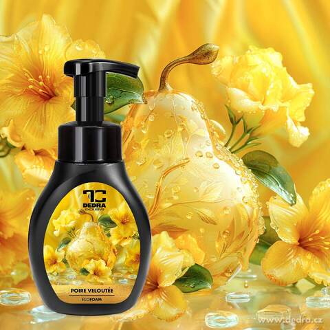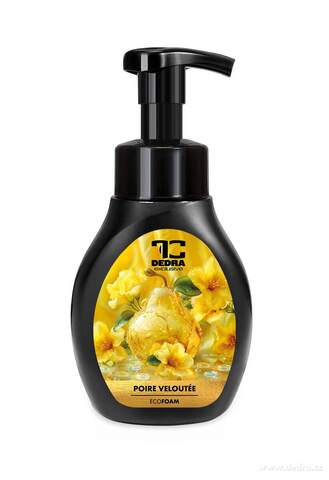 SAMETOVÁ HRUŠKA – luxusní pěna na ruce a tělo s Aloe Vera. Revoluční pumpička vytváří okamžitě sametově jemnou pěnu, která hydratuje a chrání pokožku. Vydrží až 3× déle než běžné mýdlo. Vůně sladké hrušky, melounu, růže a frézie v kombinaci s pačuli, ambrou & pižmem dodává eleganci a smyslnost. Ekologické balení, netestováno na zvířatech.