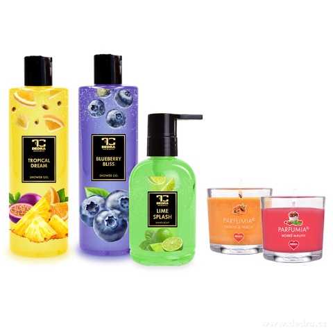 Zestaw podarunkowy OWOCOWE WELLNESS to eksplozja zapachów i koloru! Zawiera żele pod prysznic z gliceryną Tropical Dream i Blueberry Bliss, mydło w płynie Lime Splash oraz dwie pachnące świece sojowe Parfumia®. Idealny prezent łączący relaks, energię i świeżość. W komplecie przezroczysty woreczek do zapakowania.