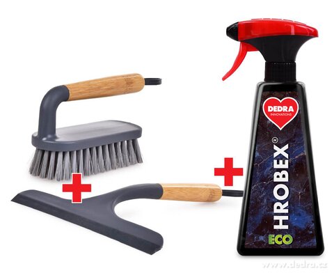 W komplecie: 1 x EKO środek do czyszczenia nagrobków i pomników, marmuru oraz granitu, ECO GROBEX® 500 ml, 1 x uniwersalna szczotka do czyszczenia i sprzątania typu żelazko z bambusowym uchwytem, 1 x ściągaczka do okien, szyb i luster z bambusowym uchwytem GoEco® BAMBOO.