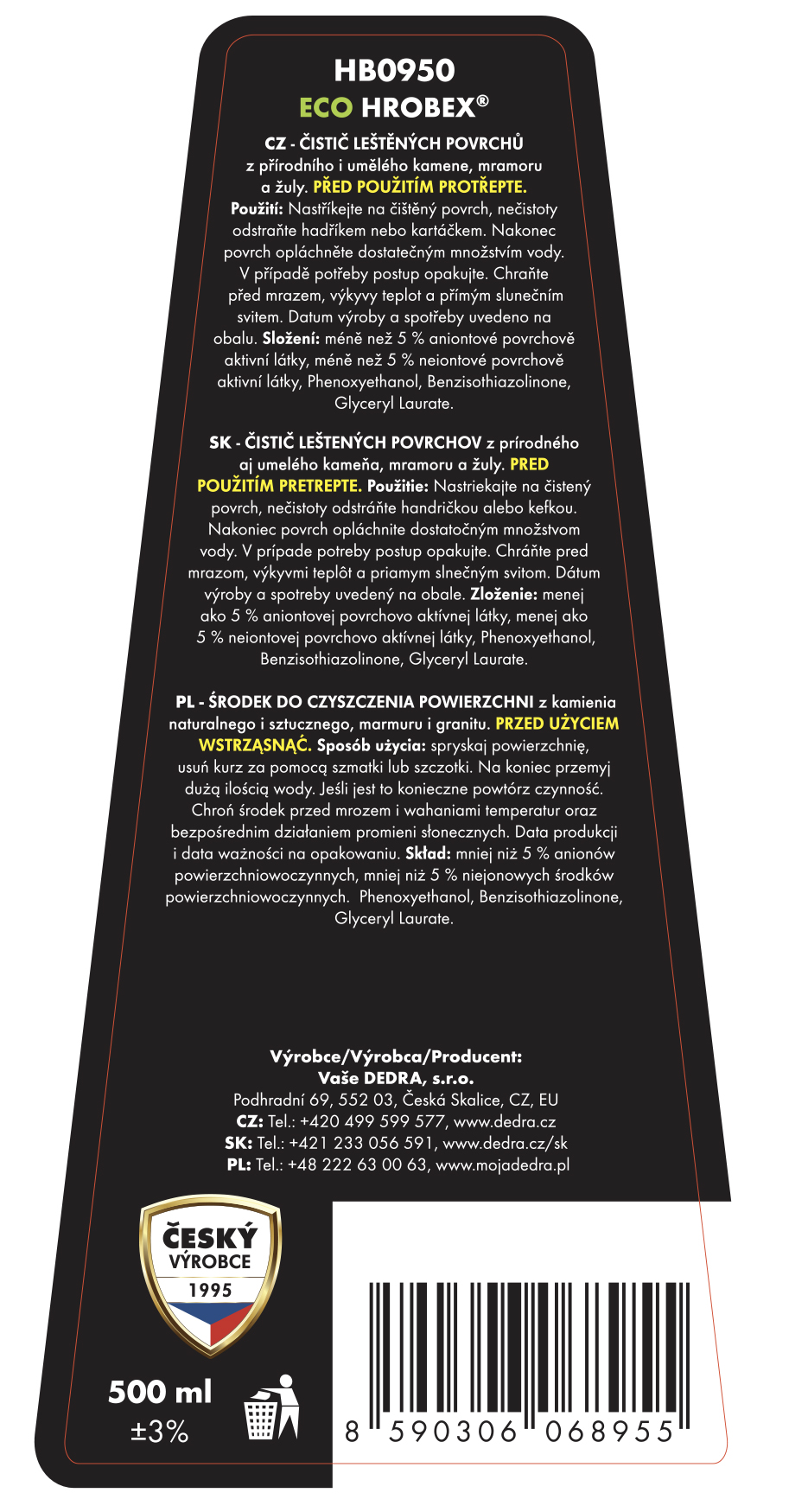 Producent / Importer: Vaše Dedra s. r. o., Podhradní 69, Česká Skalice, Republika Czeska