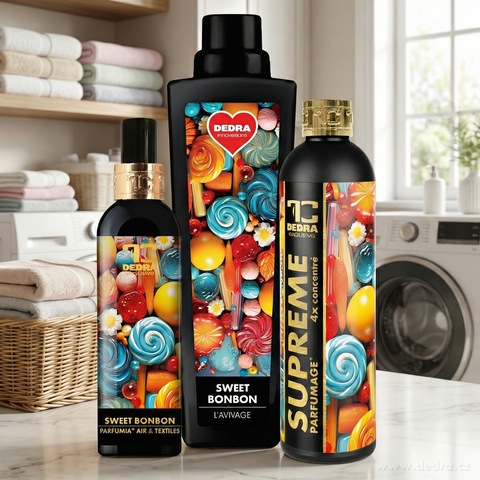 SWEET BONBON – zestaw zapachów dla prania i domu. W komplecie płyn do płukania tkanin, odświeżacz powietrza i tesktyliów oraz 4× skoncentrowane perfumy do prania dla długotrwałej i zrównoważonej woni. Praktyczne połączenie do codziennego użytku, które łączy pielęgnację prania z przyjemną atmosferą wnętrza.