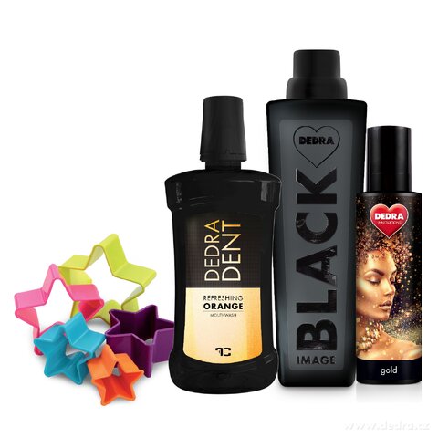 W komplecie: 1 x GWIAZDKI wykrawacze, zestaw 5 szt., 1 x naturalny ziołowy płyn do ust o smaku pomarańczy ORANGE and MENTHOL, 500 ml, 1 x żel do prania czarnego i ciemnego BLACKIMAGE® ECO SENSITIVE, 15 prań, 1 x odświeżacz powietrza i tekstyliów GOLD, 250 ml.