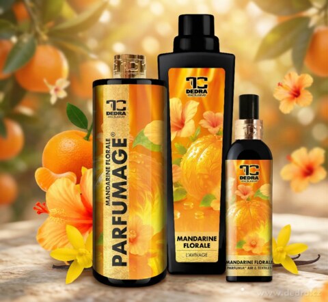 Zestaw 2+1 MANDARINE FLORALE to harmonia świeżej mandarynki i kwiatowej elegancji w trzech formach: płyn zmiękczający do tkanin, perfumy do prania i sprzątania oraz odświeżacz powietrza & tekstyliów. Spójna kompozycja zapachu, która otula pranie, wnętrze domu i tkaniny świeżością oraz subtelną, cytrusowo-kwiatową nutą.