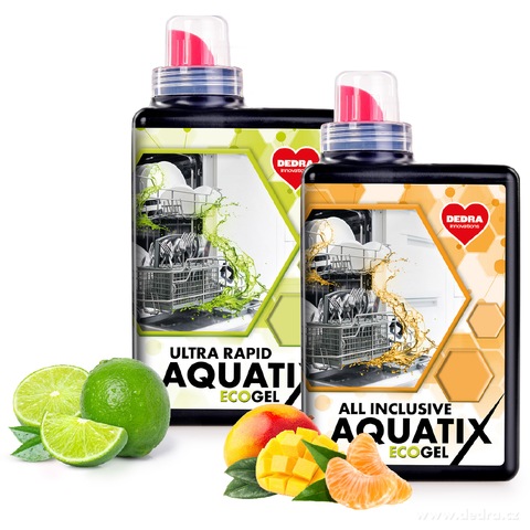 Zestaw 1+1 AQUATIX® ECOGEL do zmywarki: ULTRA RAPID + ALL INCLUSIVE. Skutecznie usuwa tłuszcz i zaschnięte zabrudzenia, nadaje połysk bez smug oraz działa nawet w krótkich programach. Ultra Rapid – orzeźwiająca limonka, All Inclusive – egzotyczne mango i mandarynka. 2080 ml = 115 myć.