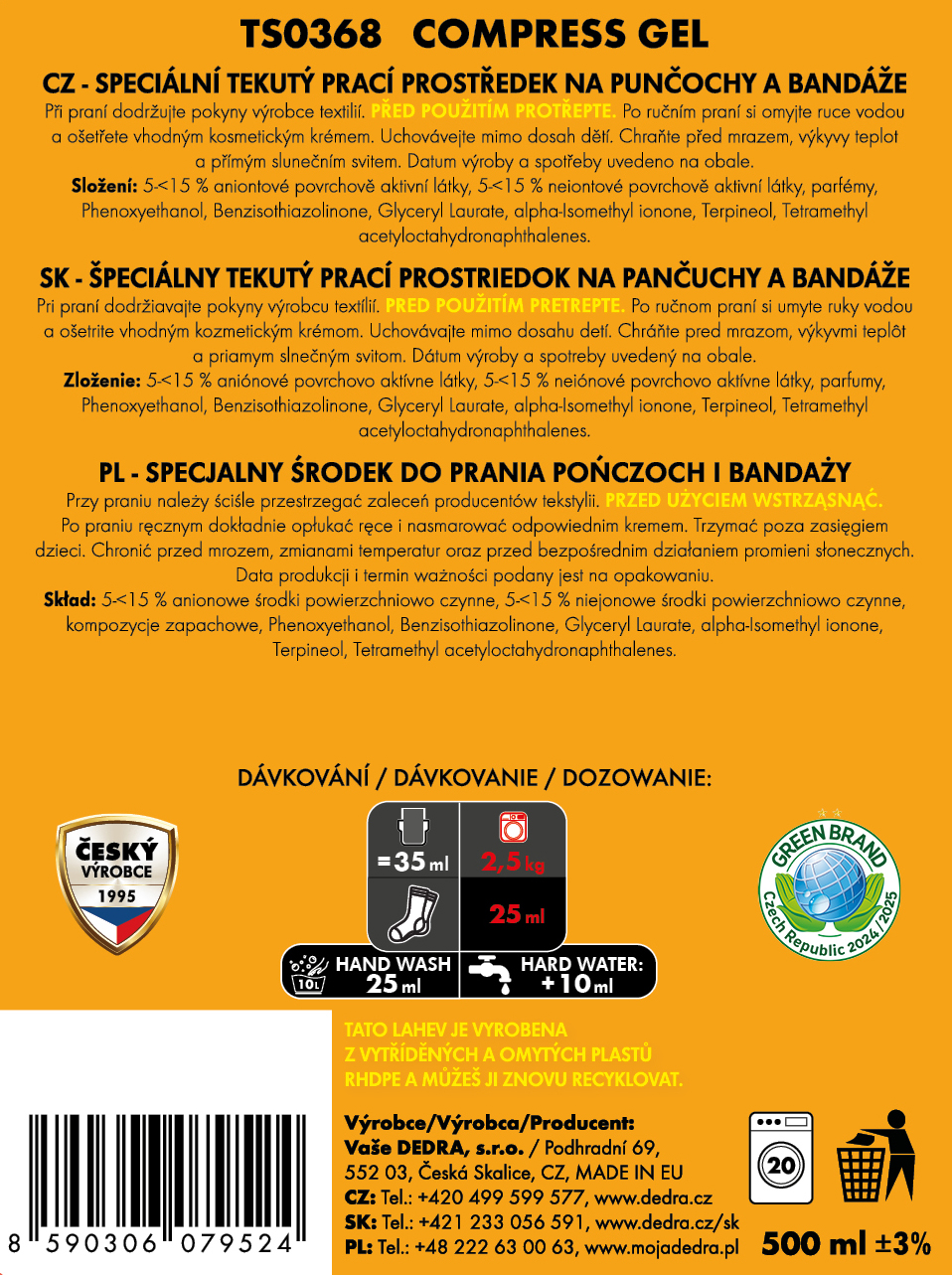 Specjalny żel do prania pończoch uciskowych, bandaży & ortez, COMPRESS, 500 ml = 20 prań.