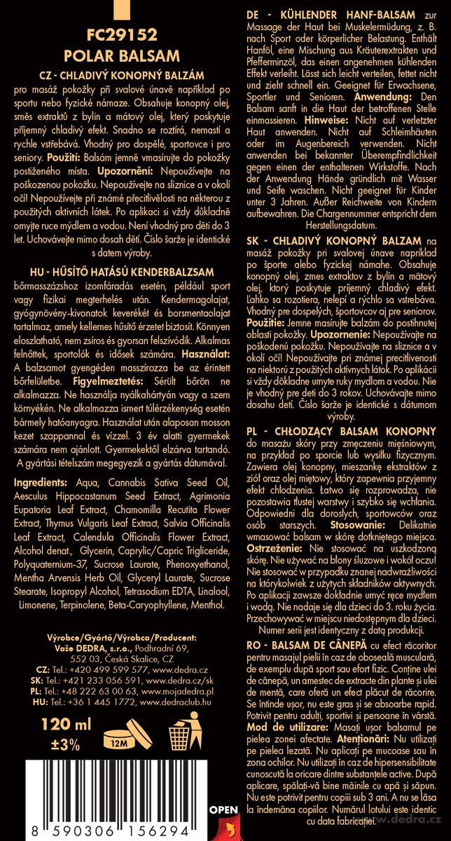 POLARBALSAM to skuteczny chłodzący balsam o wysokiej zawartości 10% oleju konopnego, przeznaczony do masażu skóry przy zmęczeniu mięśni, sztywności oraz po wysiłku fizycznym. Jego formuła została wzbogacona o olejek miętowy, który zapewnia długotrwały efekt chłodzenia oraz ekstrakty z ziół wspierające regenerację i uczucie ulgi.