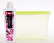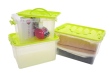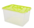Przezroczysty plastikowy pojemnik z zieloną pokrywą i uchwytem do przenoszenia. Wykonany z mocnego tworzywa sztucznego, zamykany na zatrzaski.