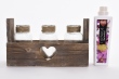 Oryginalna i ciekawa ozdoba na parapet, doda ciepła każdemu wnętrzu. Skrzynka to idealne miejsce na suche i żywe kwiaty, stwórz ciekawą kompozycję. Drewniana skrzynka z wyrzeźbionym sercem, patyna, 3 szklane wazoniki. Wymiary: 34 x 13 x 20 cm, średnica górna 5,5 cm, dno 8 cm x 16 cm.