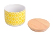 Ceramiczne naczynie z bambusową pokrywą i silikonową uszczelką, wysokość 8,5 cm, średnica 10 cm, objętość 440 ml.