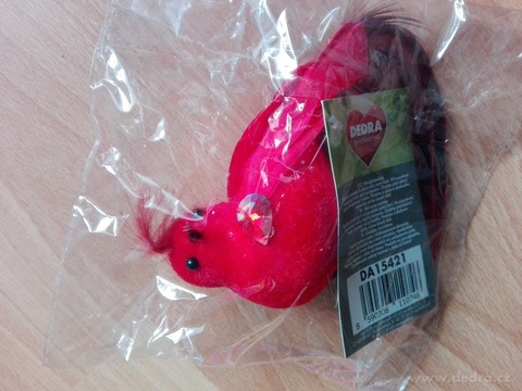 Ptak z czerwonymi piórami, mocowany na klips. Wymiary: 13 x 4 x 7 cm.
