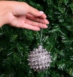 2 srebrne bombki z kolcami, błyszczące, średnica 7 cm.