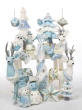 Białe i błękitne dekoracje, pokryte aksamitną tkaniną, bogato zdobione lśniącymi kamieniami.