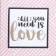 Obraz na płótnie z efektem glitter i napisem ALL YOU NEED IS LOVE, o wymiarach 28 x 28 cm.