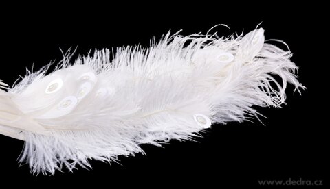 Biały paw ozdobiony perełkami, delikatnymi piórkami i cekinami w długiej części ogonowej,