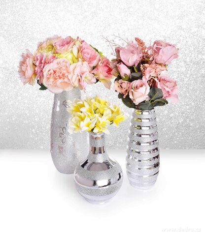 Dekoracyjny wazon ceramiczny z ozdobną srebrną glazurą. Wymiary: średnica 11 cm, wysokość 31 cm.