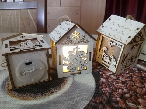 Drewniany dekoracyjny domek ze świątecznym motywem dzwoneczków,