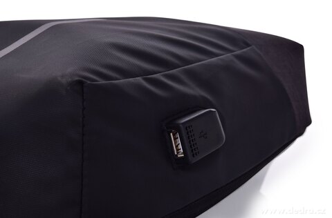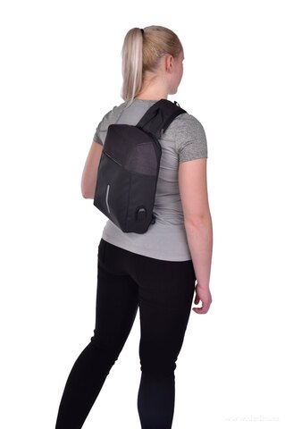 Solidny plecak skośny z połączeniem USB i elementami odblaskowymi, w dolnej części zmywalna tkanina.