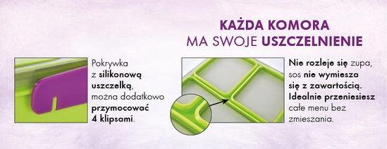 Przedstawiamy Ci szeroką gamę pomocników do przechowywania i przenoszenia żywności. Będziesz oczarowany/a praktycznie zaprojektowanymi detalami i akcesoriami.Przygotuj smaczną przekąskę lub lunch do pracy i na wycieczkę do praktycznego pudełka ze specjalną pokrywką z silikonową uszczelką, która zapobiega przelewaniu sosu do żywności. ![]()