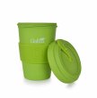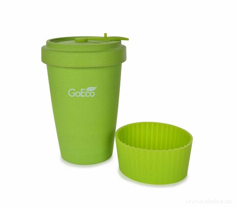 Kubek i zakręcane wieko ze sprasowanego bambusa, z silikonowym zdejmowanym paskiem antypoślizgowym. Pokrywka z wewnętrzną uszczelką silikonową. Wymiary: średnica 9,5 cm, wysokość 13,5 cm.
