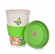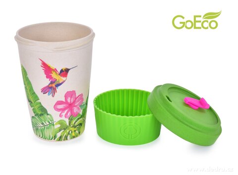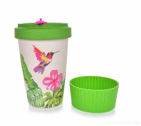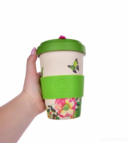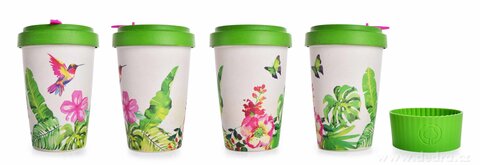 Kubek i zakręcane wieko ze sprasowanego bambusa, z silikonowym zdejmowanym paskiem antypoślizgowym. Pokrywka z wewnętrzną uszczelką silikonową. Wymiary: średnica 9,5 cm, średnica dolna 6 cm, wysokość 13,5 cm.