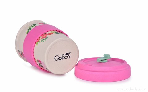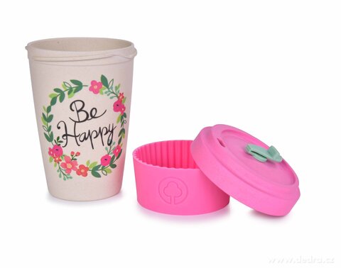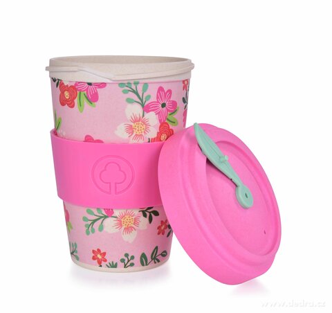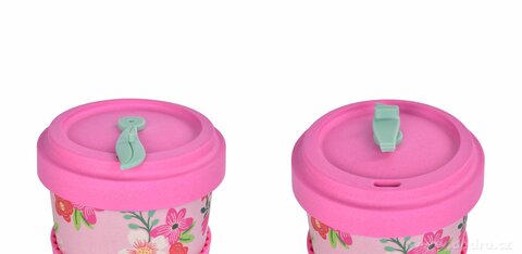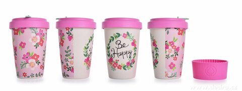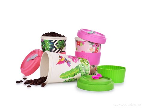 Kubek i zakręcane wieko ze sprasowanego bambusa, z silikonowym zdejmowanym paskiem antypoślizgowym. Pokrywka z wewnętrzną uszczelką silikonową. Wymiary: średnica 9,5 cm, średnica dolna 6 cm, wysokość 13,5 cm.