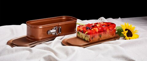 Duża owalna rozkładana forma z jakościową złoto-miedzianą powłoką nieprzywierającą premium BIOPAN® GOLD – idealna do wypieków oraz deserów bez pieczenia. Ta powłoka zapewnia doskonałe uwalnianie potraw, wysoką odporność na ścieranie i łatwe czyszczenie. Metalowa klamra umożliwia proste odpięcie obręczy, a praktyczne dno z tłoczeniem ułatwia wygodne przenoszenie oraz stylowe serwowanie.