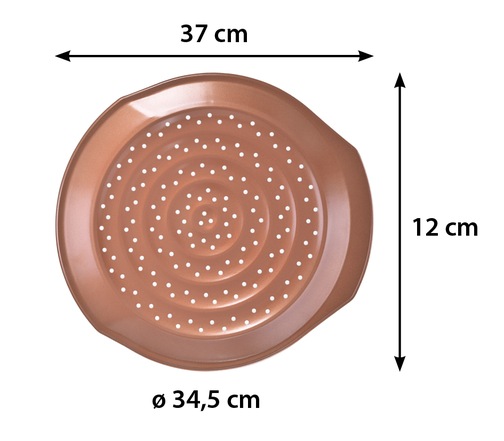 Praktyczna blaszka do pieczenia pizzy i frytek ze stali ze złoto-miedzianą powierzchnią nieprzywierającą BIOPAN® GOLD premium, która jest łatwa w utrzymaniu i trwała.