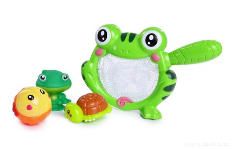 SIEĆ ŻABKA, zestaw do wanny z siatkowym koszem w kształcie żaby i trzema różnymi zwierzątkami.