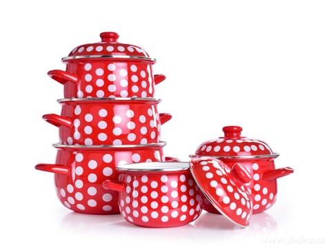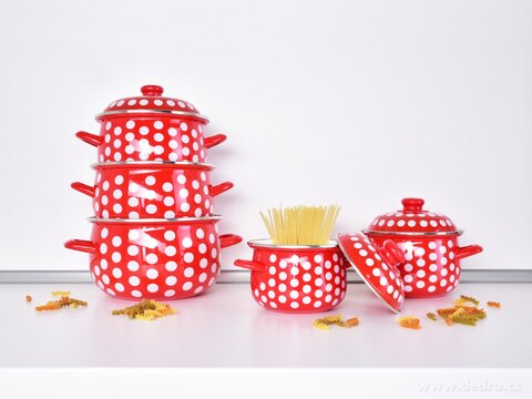 10- elementowy zestaw emaliowanych garnków w grochy z pokrywkami.