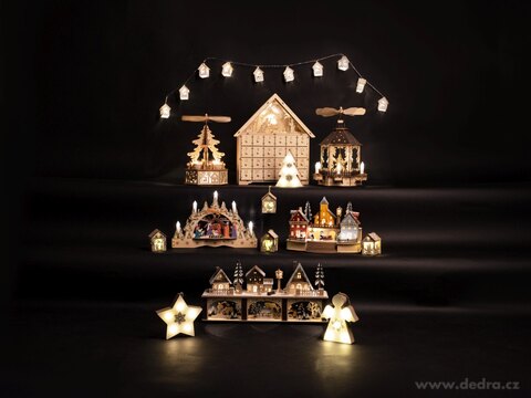 Drewniany domek dekoracyjny z motywem świątecznym i oświetleniem LED.