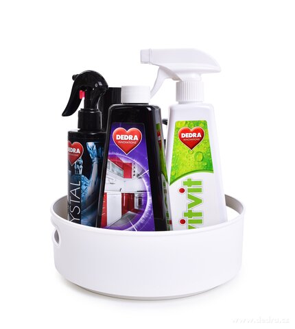 360° obrotowa taca/organizer do szafki, lodówki i na stół, z boku praktyczne uchwyty do przenoszenia, antypoślizgowa powierzchnia przestrzeni do przechowywania, na dole mechanizm obrotowy z gumowymi podkładkami antypoślizgowymi, wykonano z mocnego plastiku.