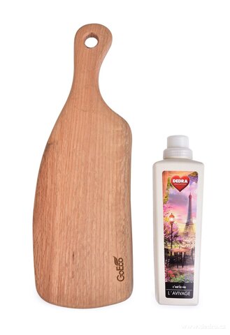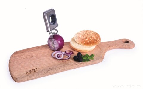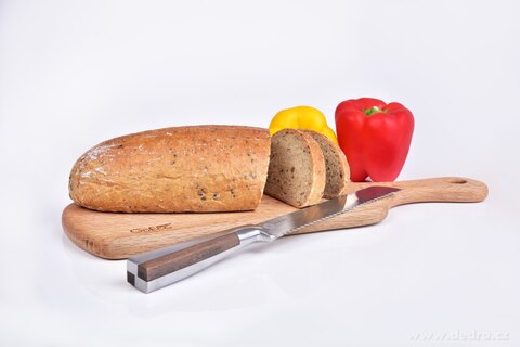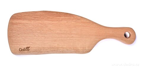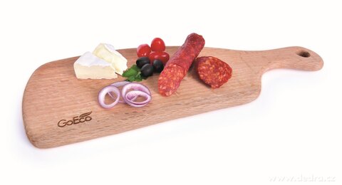 Přírodní prkénko z masivního bukového dřeva, díky otvoru lze zavěsit, tloušťka prkénka cca 1,8 cm, nepravidelný tvar, cca š 15 x d 46 cm