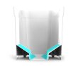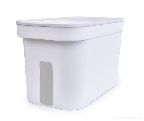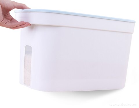 z odpornego plastiku, od góry wieko na zawiasach (ok. 17 x 17 cm), w zestawie plastikowa miarka, od spodu 2 kółka.