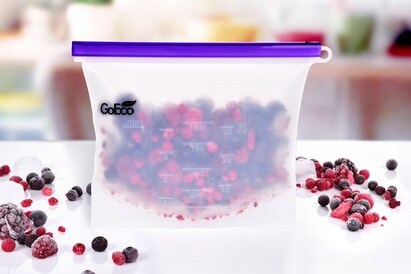 DOŻYWOTNI SILIWOREK GoEco® 1000 ml wielofunkcyjny silikonowy woreczek na żywność wielokrotnego użytku ze skalą pomiarową, hermetyczne zamknięcie z plastikowym klipsem. Odporny na temperatury od -30 °C do 230 °C. Wymiary ok. 18 x 23 cm.