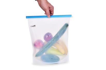 DOŻYWOTNI SILIWOREK GoEco® 4000 ml wielofunkcyjny silikonowy woreczek na żywność wielokrotnego użytku ze skalą pomiarową, hermetyczne zamknięcie z plastikowym klipsem. Odporny na temperatury od -30 °C do 230 °C. Wymiary ok. 34 x 34 cm.