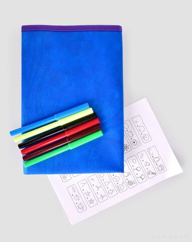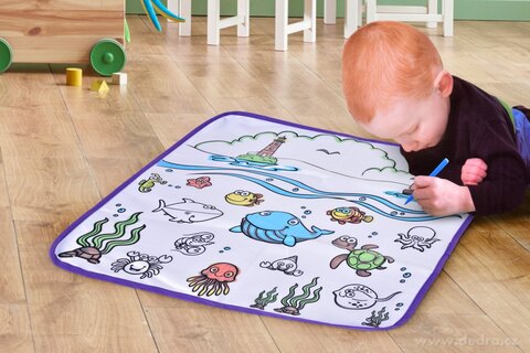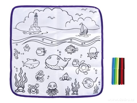 Zmywalna mata rysunkowa + 6 kolorowych pisaków. Można prać w pralce. Wymiary: 48 x 47 cm.