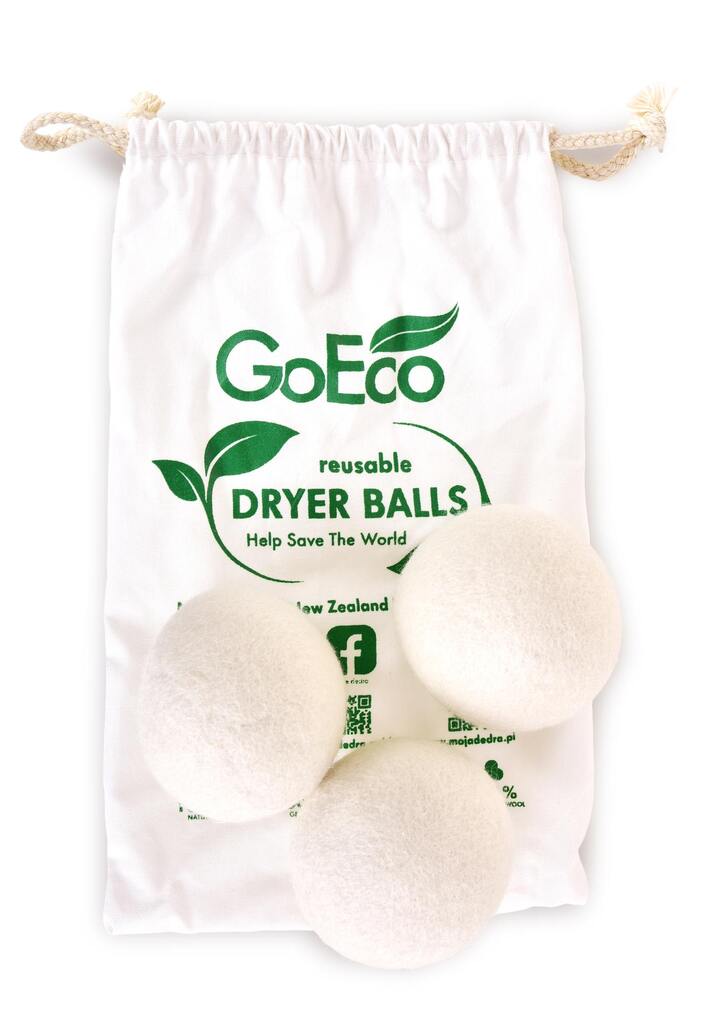 GoEco® SUSZARKOKULE – zestaw 3 szt. z prawdziwej wełny owczej oszczędza czas i energię podczas suszenia prania (skracają proces nawet o 20%). Wielokrotnego użytku zamiast jednorazowych chusteczek, nie pozostawiają włókien, można nadać im zapach perfumami do prania. W praktyczny. woreczku bawełnianym.