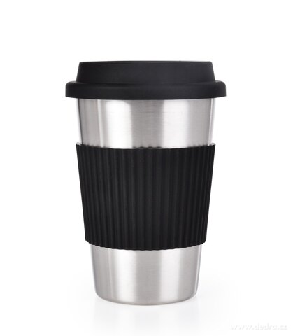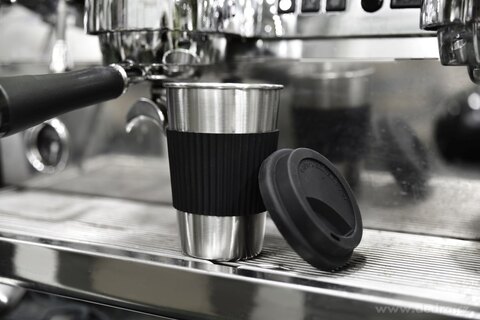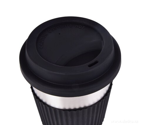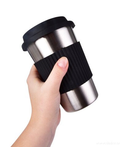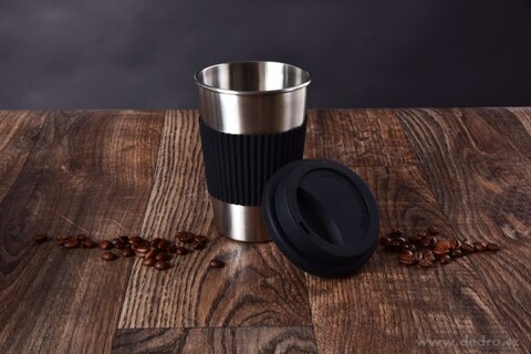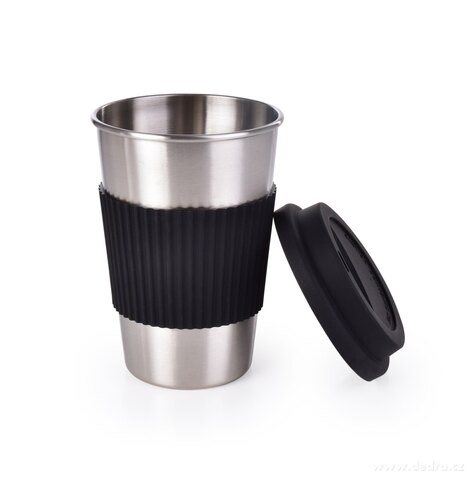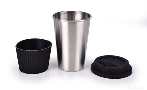 500 ml NIERDZEWNY KUBEK KELIMERO® z silikonowym zdejmowanym paskiem i wieczkiem, średnica 8,5 cm, wysokość 12,5 cm (z pokrywką 14 cm).