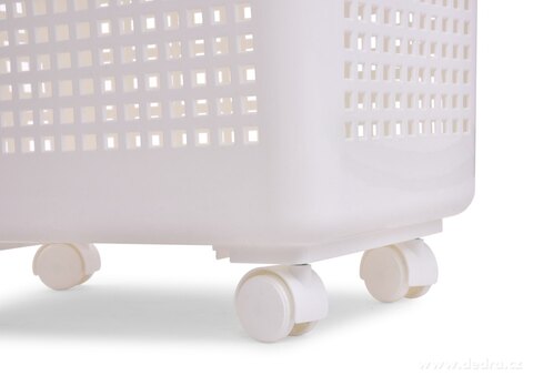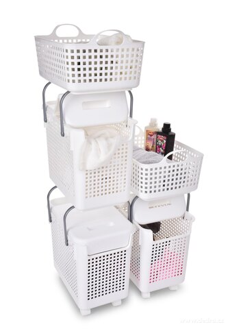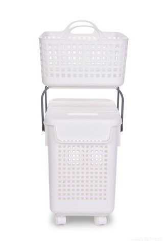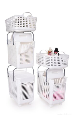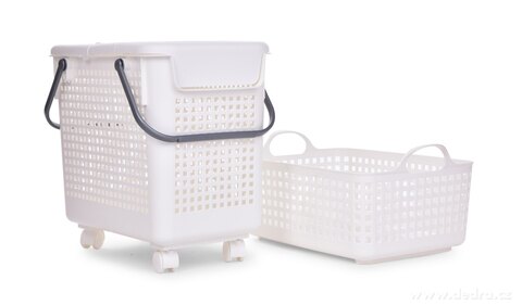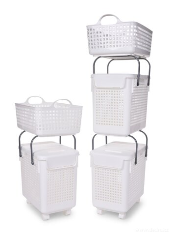 Mobilne kosze do przechowywania z 4 kołami dla łatwej manipulacji, 2 kosze, można praktycznie stawiać na sobie osadzając uchwyty koszy, w dolnych koszach uchylne pokrywy. Wymiary: 32 x 47 x wysokość 75 cm.