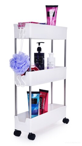 Mobilny regał do wąskich przestrzeni z 4 zdejmowanymi haczykami do zawieszenia i 4 kółkami dla łatwej manipulacji. Połączenie metalu i plastiku. Głębokość 39 cm, 3-piętrowy.
