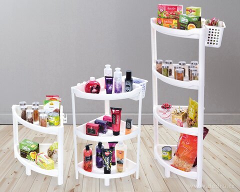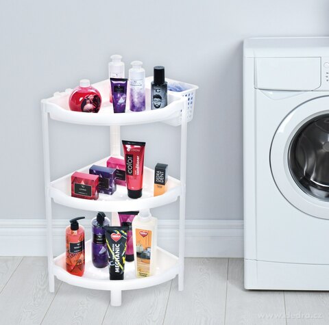 Piętrowy regał narożny z dodatkowym wiszącym koszykiem (19,5 x 11,5 x 12 cm) i haczykami. Wykonano z solidnego plastiku. Wymiary: szer. 44 x gł. 31 cm x wys. 70 cm.