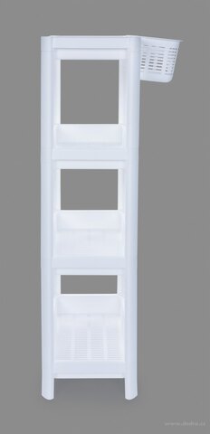 Piętrowy prostokątny regał z dodatkowym zawieszanym koszykiem do wąskich przestrzeni w mieszkaniu. Wykorzystasz go w martwych miejscach i poszerzysz tak przestrzeń do składowania na przykład obok mebli kuchennych, pralki, ale i w pokoju dziecięcym czy gabinecie. 👍
