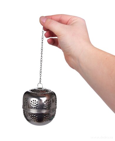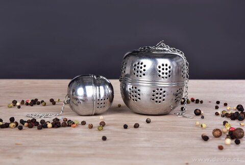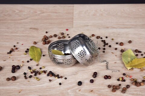 Jajko/sitko na przyprawy ze stali nierdzewnej, z łańcuszkiem i haczykiem do łatwego zawieszenia na krawędzi naczynia. Średnica 6,5 cm.
