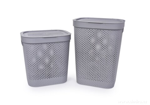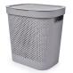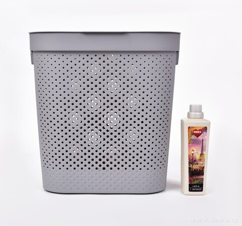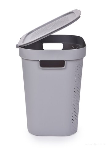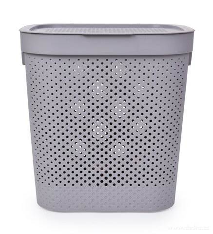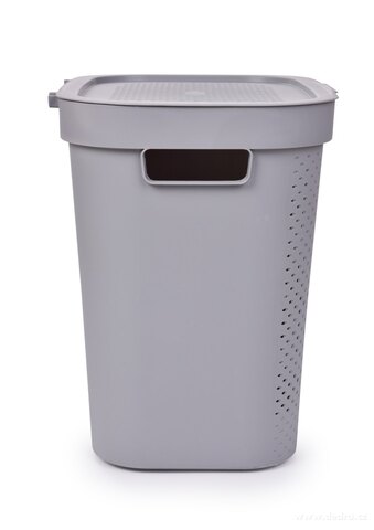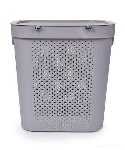 Kosz do składowania nie tylko prania z pokrywą na zawiasach, z boku otwory dla łatwego przenoszenia, wykonano z wytrzymałego tworzywa sztucznego. Wymiary:43,5 x 34,5 x 45 cm.