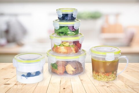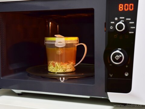 Ten pojemnik z praktyczną zamykaną pokrywką i silikonową uszczelką możesz używać do przenoszenia zup i innych płynów, które następnie dzięki zaworowi kołyskowemu możesz łatwo podgrzać bezpośrednio z pokrywką w mikrofalówce.