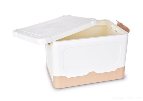 Pojemnik do przechowywania z wiekiem, z możliwością zatrzaśnięcia na dwa klipsy, uchwyty po bokach dla łatwego przenoszenia.